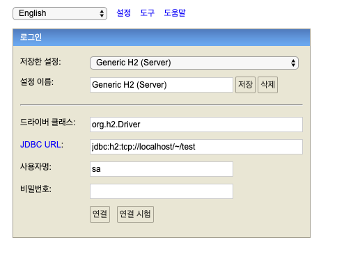 기본적인 h2 콘솔의 형태는 다음과 같이 되어 있을 것이다.