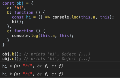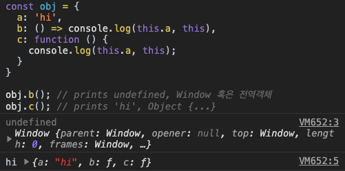 obj.b(); // prints undefined, Window 혹은 전역객체