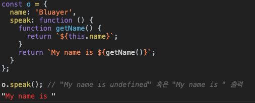 객체 o의 speak 함수 내부의 getName에선 this를 어떤 것으로 생각하고 있을까?