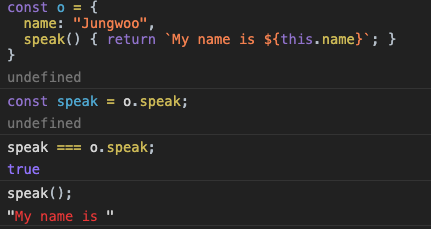 놀랍게도 같은 함수를 가리키고 있지만, this는 제대로 표현되지 않는다.