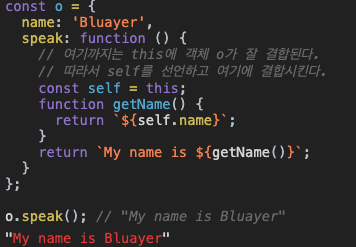 객체 o에서 호출된 speak에 할당된 익명 함수에서는 당연히 this에 객체 o가 잘 결합하지 않겠는가?