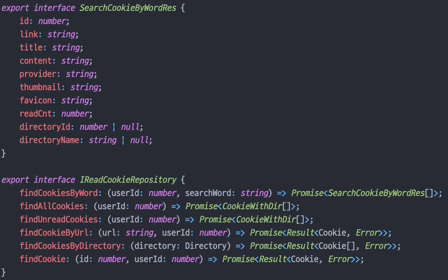 ㄴ interfaces: repository에 대한 인터페이스들을 정의해놓은 곳. DTO에 대한 인터페이스들을 정의해놓음.