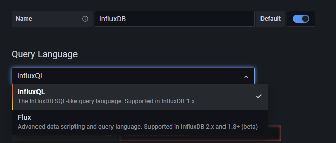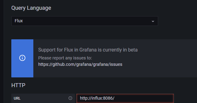 아래와 같이 InfluxQL이 아닌 Flux를 선택하게 되면 연결해야 하는 정보부터 달라지는 것을 볼 수 있다.