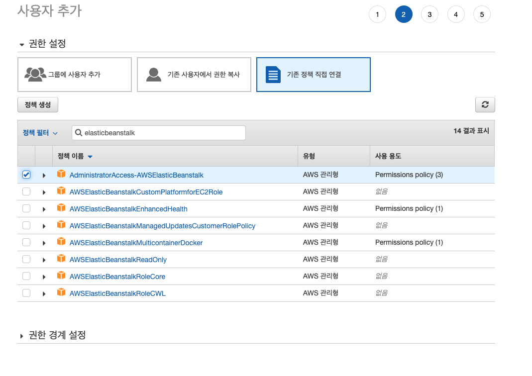 기존 정책 직접 연결을 누르고, elasticbeanstalk를 검색해서 Admin 권한을 주자.