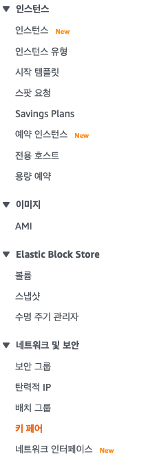 AWS EC2에 접속한 후 사이드 바의 키 페어를 누르자.