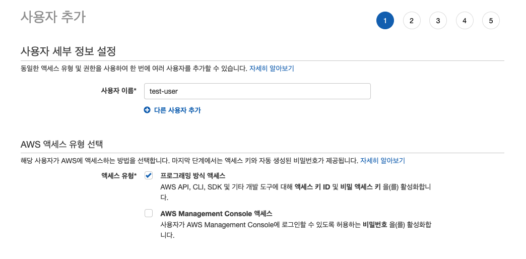 원하는 사용자 이름을 적어주고, 프로그래밍 방식 액세스를 선택해주자.
