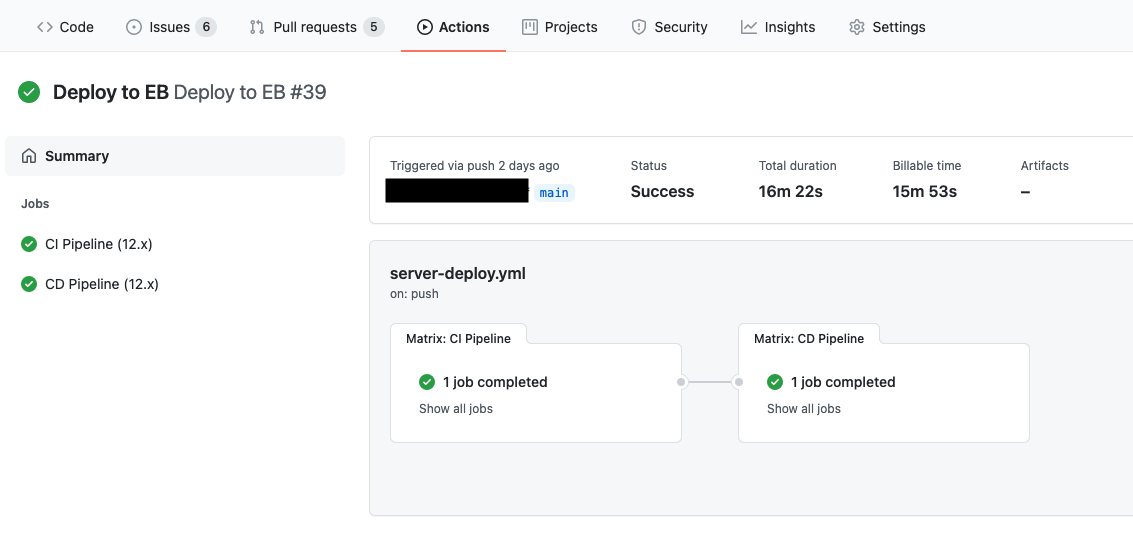 main branch에 만든 yaml이 담긴 .github/workflows 폴더를 push하면 배포가 시작된다!