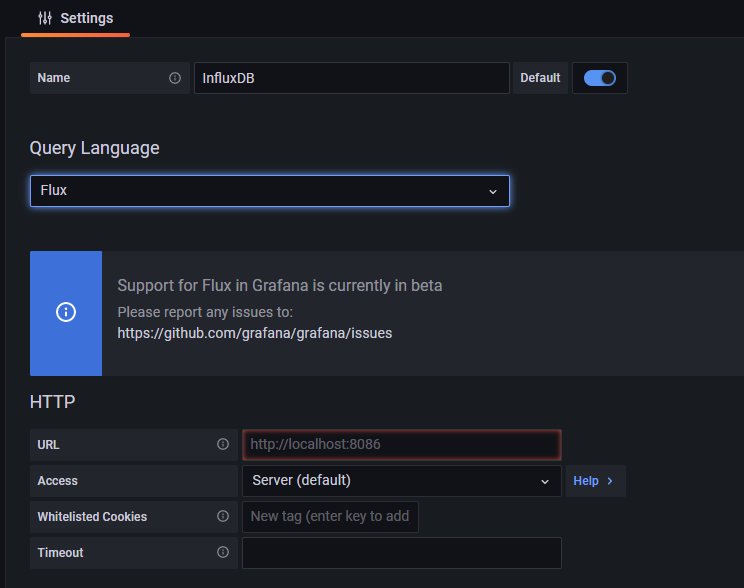 따라서 Query Language로 Flux를 선택하고, URL을 적어주도록 하자.(http://<instance ip>:8086)