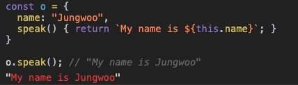 객체 o에서 호출된 speak에 할당된 익명 함수에서는 당연히 this에 객체 o가 잘 결합하지 않겠는가?